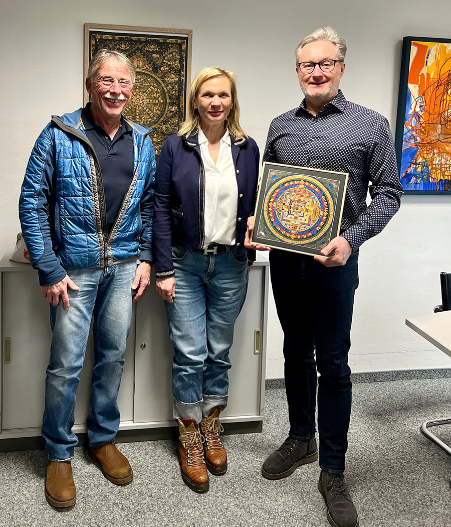 Der Vereinsvorsitzende Peter Meckler und seine Vorstandskollegin Katharina Hage bedankten sich für die großzügige Unterstützung persönlich und überreichten Gerald Vogt ein handgemaltes Mandala aus Nepal. Das Geld fließt u.a. in Renovierungen, gendergerechte Toilettenneubauten und Lehrerfinanzierungen an Schulen im Himalaya.