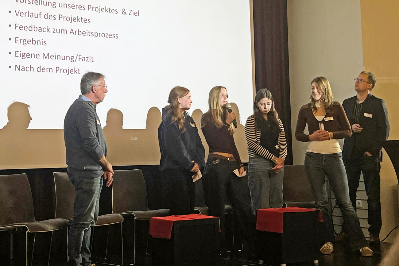 Auf der Veranstaltung „Schule engagiert – Zivilgesellschaft als Bildungspartner“ am 05.12.25 im vollbesetzten Eppeleinsaal der Nürnberger Burg durften Schülerinnen der Klasse 9d der Johannes-Scharrer-Realschule Hersbruck ihr Projekt im Rahmen der Initiative „EINMISCHEN!“ des LBE (Landesnetzwerk Bürgerschaftliches Engagement Bayern) als gutes Beispiel aus der Praxis vorstellen (https://www.ehrenamt.bayern.de, https://einmischen.org). Geleitet wurde die Veranstaltung von Hans Stanka vom LBE in Nürnberg.